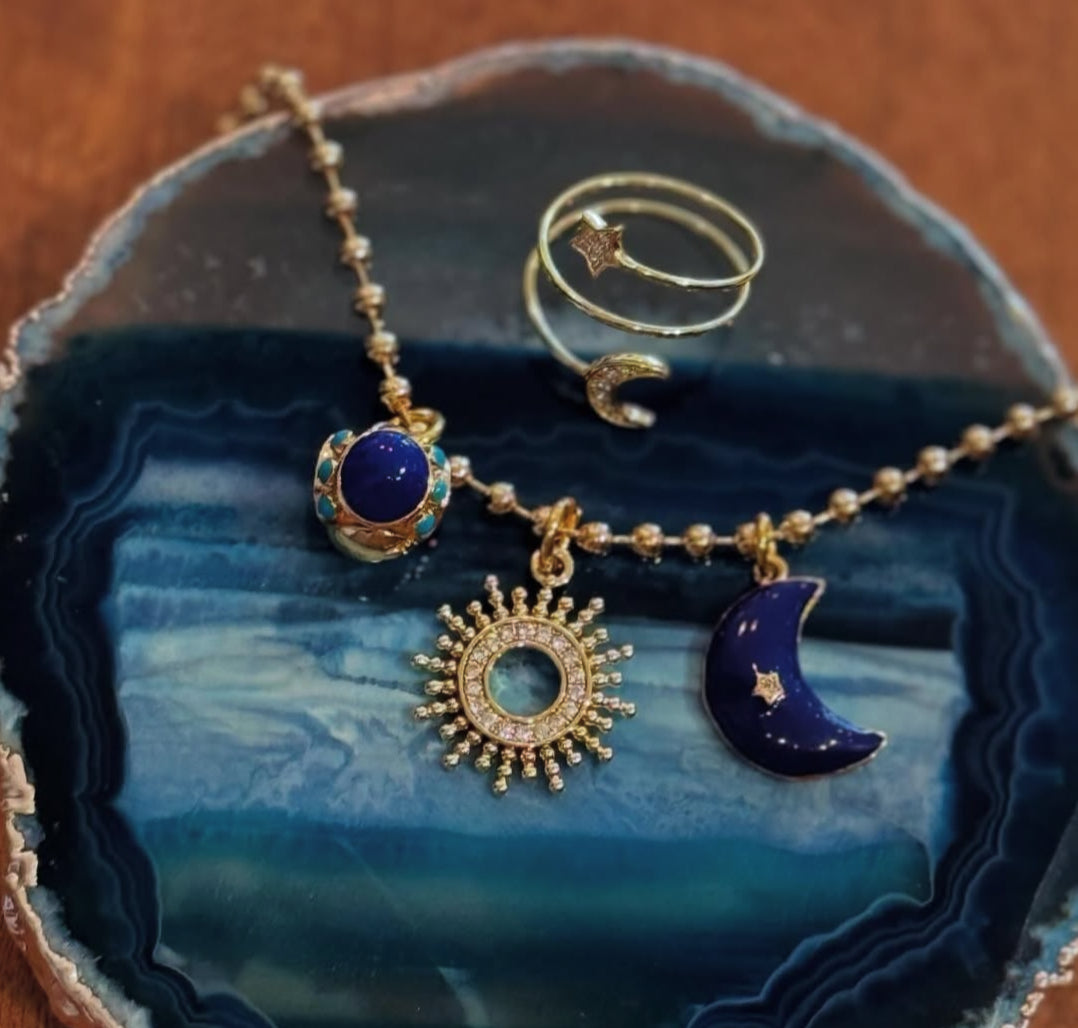 This simple wrap moon and star pave ring is so much fun to wear on any finger! Just wraps around your finger easily with a pretty wrap design! Available in gold vermeil in sizes 6, 7 and 8.